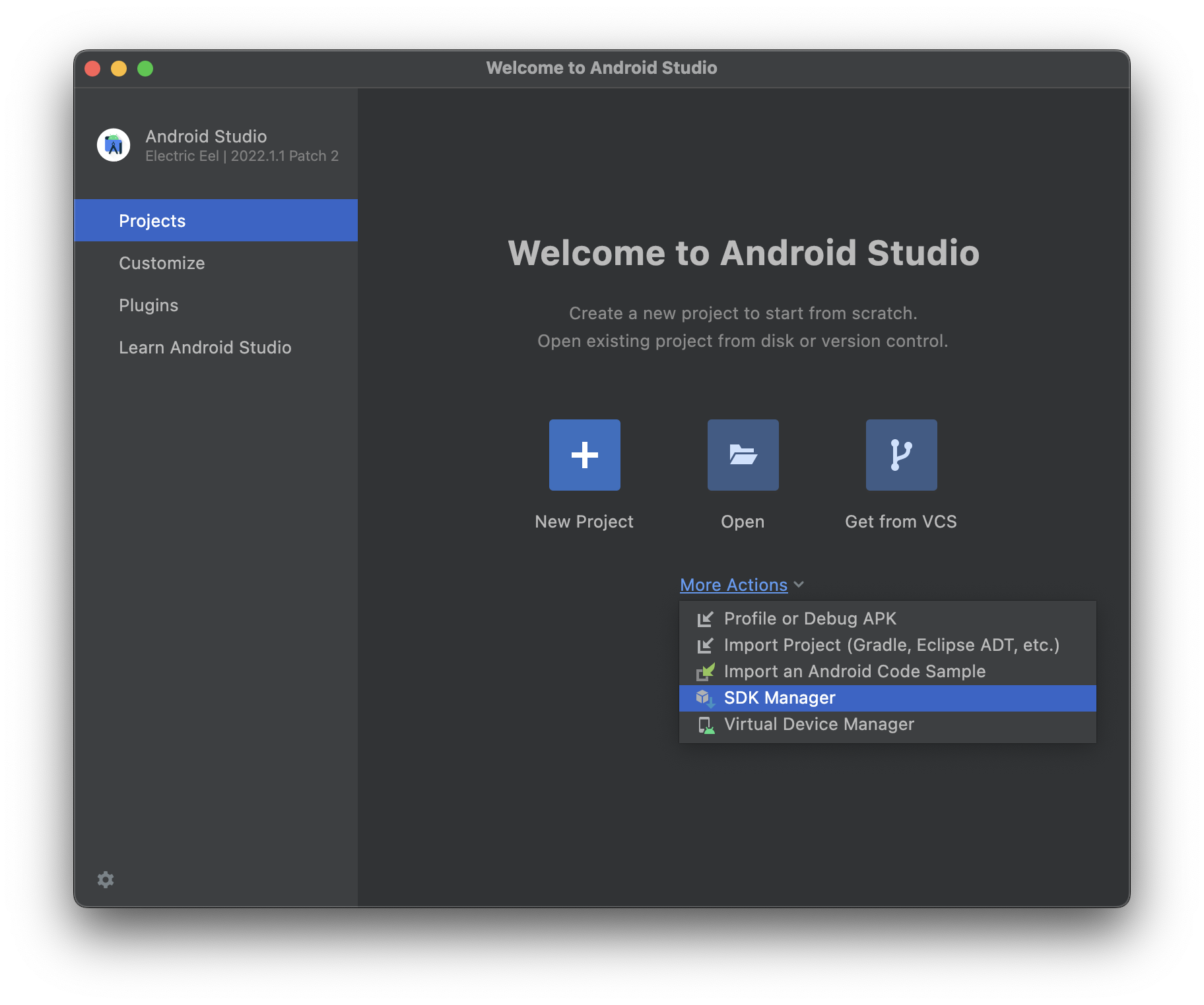 우선 Android Studio를 실행해서 Welcome 화면에서 More Actions > SDK Manager를 실행합니다.