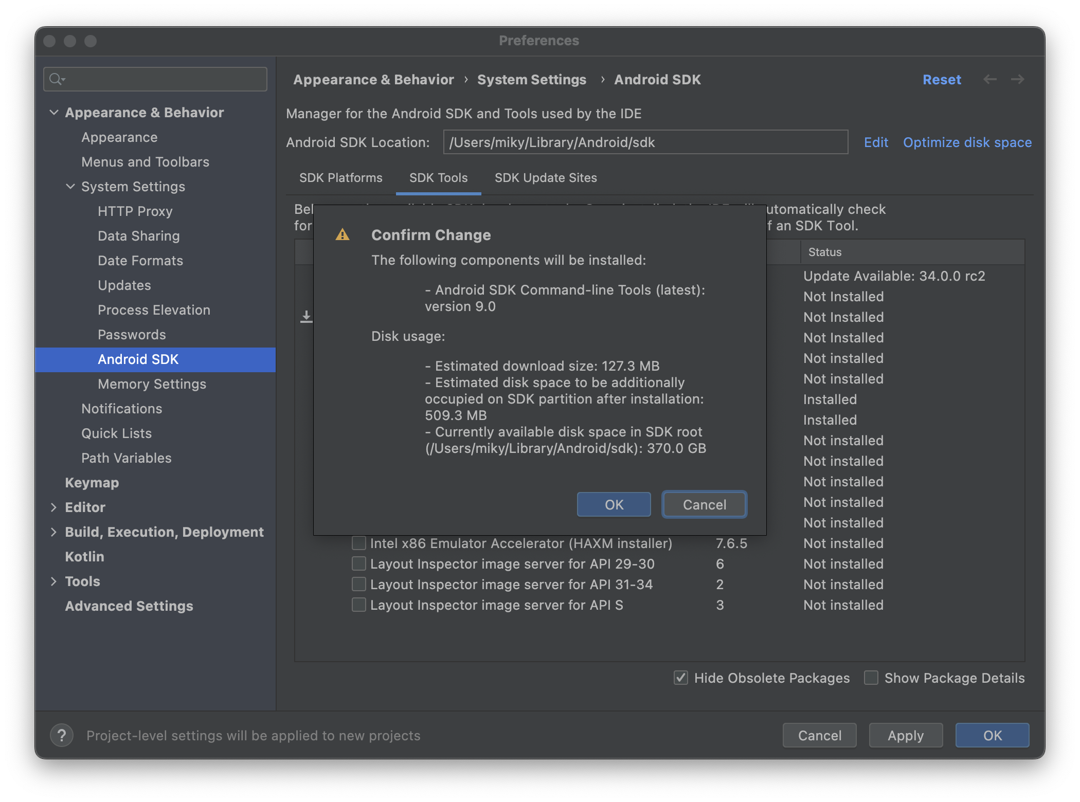 이 때 제 경우에는 Android SDK Build-Tools 34-rc2가 Update Available이라고 나와서 최신 상태로 설정하기 위해 이것도 함께 설치를 진행했어요. 이 부분은 필수 설정은 아니에요.